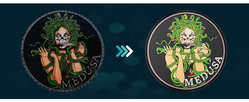 Men ... der er en hage! Hvis du for enhver pris vil bevare din grafik (1) med alle dens nuancer og finurligheder, har vi også løsningen til dette: et PVC-mærke plus sublimeret tryk!
